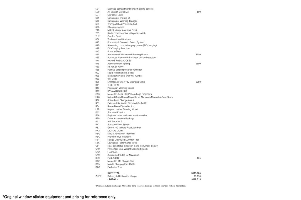 UPGRADED EQUIPMENT: PRE-SAFE Rear Seat Package, Exclusive Trim, EV Services, Apple CarPlay™, Android Auto, 21" Five-Spoke Wheels w/ Black Accents, Rear-Axle Steering 10 Degree, Garage Door Opener, Active Distance Assist DISTRONIC®, PARKTRONIC with Active Parking Assist, Active Lane Keeping Assist, Auto-dimming Driver and Rearview Mirrors, Rear sensors for the lane departure assistant, Active Distance Assist DISTRONIC® with Active Steering Assist, Pre-Safe Impulse Side, Fingerprint scanner, LED Lightband, Sound personalisation, Remote Services Premium, Extended MBUX functions", Remote and extended Charging Services Plus, MB Navigation, Live Traffic, Communications module (5G) for the use of Mercedes me connect services, Front Multicontour Seats w/ Massage, Heated & Ventilated Front Seats, Panorama Sunroof, Head-Up Display, 12.3" Digital Instrument Cluster, Tire Pressure Monitoring System, Power Folding Mirrors, Surround View Camera, Speed Limit Assist, HD Radio, MBUX multimedia system, Double Sun Visors, Active Speed Limit Assist, Anti-Theft Alarm System, Macchiato Beige Headliner, Four-Zone Climate Control, Side Mirror Logo Projector, Stowage compartment beneath centre console, Starpanel Grille