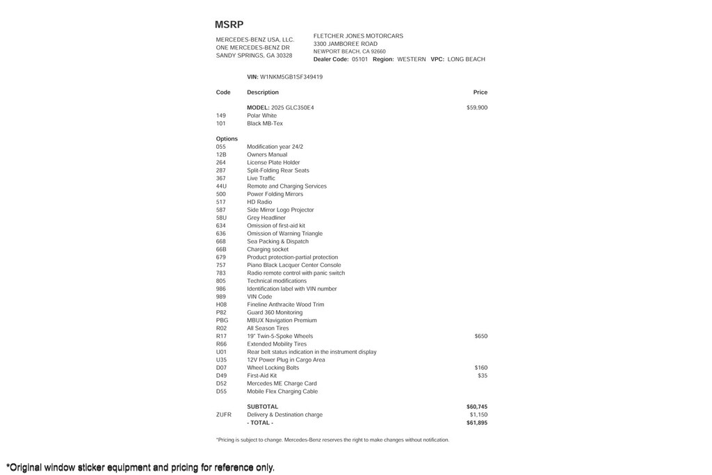 Fletcher Jones Motorcars, the nation’s #1 certified pre-owned Mercedes-Benz sales center, presents this 2025 Mercedes-Benz GLC 350e 4MATIC SUV. This Mercedes-Benz has 6,042 miles and comes in a Polar White on Black color combination. Live out of the area? Contact us to discuss convenient delivery options. (949) 718-3000
