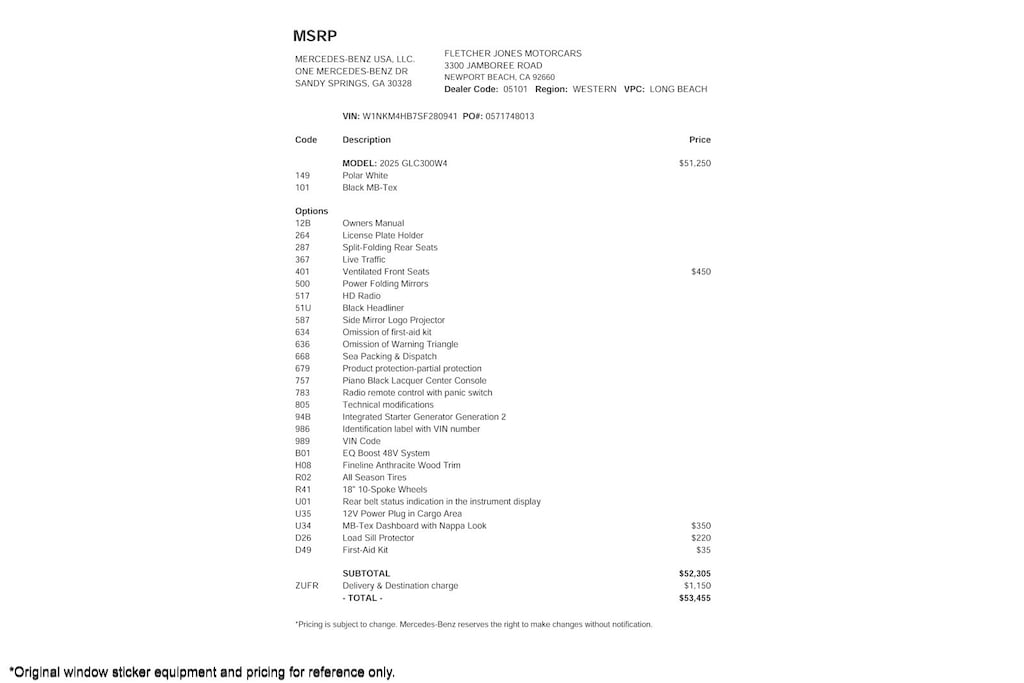 Lease specials available on this GLC! Fletcher Jones Motorcars, the nation’s #1 certified pre-owned Mercedes-Benz sales center, presents this 2025 Mercedes-Benz GLC 300 4MATIC SUV. Only 8,920 miles on this courtesy service loaner! This is a rare opportunity to purchase an ultra-low mileage, well upgraded, Mercedes-Benz at a tremendous savings. This excellent condition GLC 300 4MATIC SUV comes in a stunning Polar White on Black color combination. If we can assist you with any questions, or to schedule a test drive, please contact us at (949) 718-3000