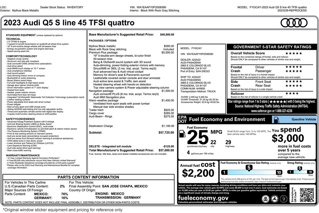 UPGRADED EQUIPMENT: Premium Plus package, 19" 5-double-arm design wheels, bi-color finish, Bang & Olufsen® sound system with 3D sound, Auto-dimming, power-folding exterior mirrors with memory, Audi advanced key & Audi virtual cockpit, Memory for driver's seat & Panoramic sunroof, Leatherette covered center console and door armrests, Audi active lane assist & Traffic Jam assist, Heated steering wheel with hands-on detection, Top view camera system & Power adjustable steering column, Navigation package, Audi MMI Navigation plus, Warm weather package, Ventilated front sport seats with power lumbar, Manual rear side window shades, Trailer hitch, Audi Beam - Rings
