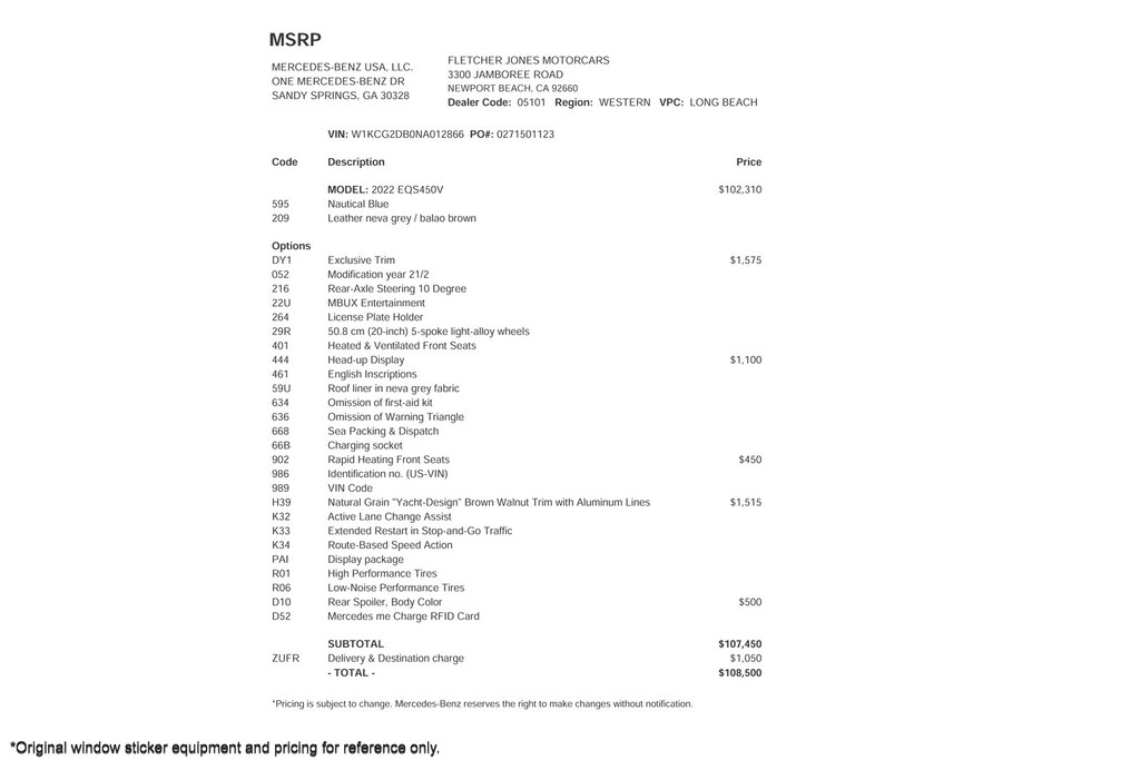 Fletcher Jones Motorcars, the nation’s #1 certified pre-owned Mercedes-Benz sales center, presents this 2022 Mercedes-Benz EQS EQS 450+ Sedan. This Mercedes-Benz has 15,726 miles and comes in a Nautical Blue Metallic on Neva Grey/Sable Brown color combination. Live out of the area? Contact us to discuss convenient delivery options. (949) 718-3000