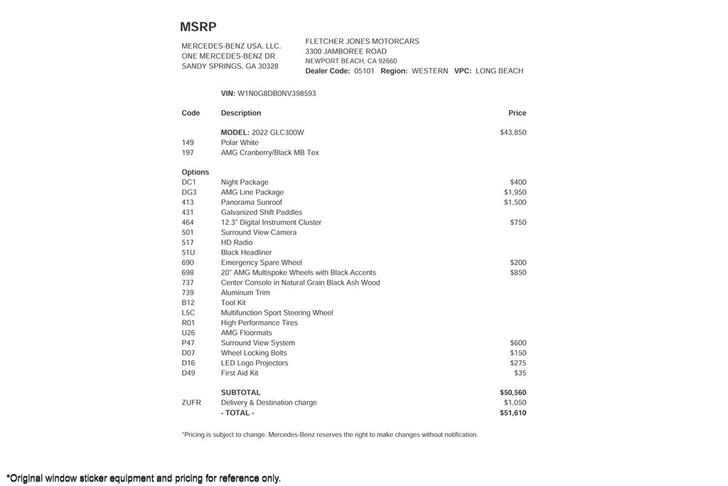 Fletcher Jones Motorcars, the nation’s #1 certified pre-owned Mercedes-Benz sales center, presents this 2022 Mercedes-Benz GLC GLC 300 SUV. This Mercedes-Benz has 16,474 miles and comes in a Polar White on AMG Cranberry Red/Black color combination. Live out of the area? Contact us to discuss convenient delivery options. (949) 718-3000