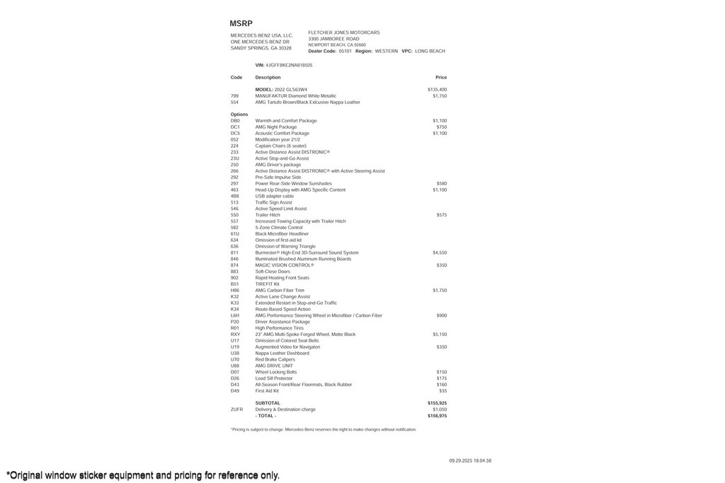 UPGRADED EQUIPMENT: Warmth and Comfort Package, AMG Night Package, Acoustic Comfort Package, Captain Chairs (6 seater), Active Distance Assist DISTRONIC®, Active Stop-and-Go Assist, AMG Driver's package, Active Distance Assist DISTRONIC® with Active Steering Assist, Pre-Safe Impulse Side, Power Rear-Side Window Sunshades, Head-Up Display with AMG Specific Content, Traffic Sign Assist, Active Speed Limit Assist, Trailer Hitch, Increased Towing Capacity with Trailer Hitch, 5-Zone Climate Control, Black Microfiber Headliner, Burmester® High-End 3D-Surround Sound System, Illuminated Brushed Aluminum Running Boards, Soft-Close Doors, Rapid Heating Front Seats, TIREFIT Kit, AMG Carbon Fiber Trim, Active Lane Change Assist, Extended Restart in Stop-and-Go Traffic, Route-Based Speed Action, AMG Performance Steering Wheel in Microfiber / Carbon Fiber, Driver Assistance Package, 23" AMG Multi-Spoke Forged Wheel, Matte Black, Nappa Leather Dashboard, Red Brake Calipers, Load Sill Protector