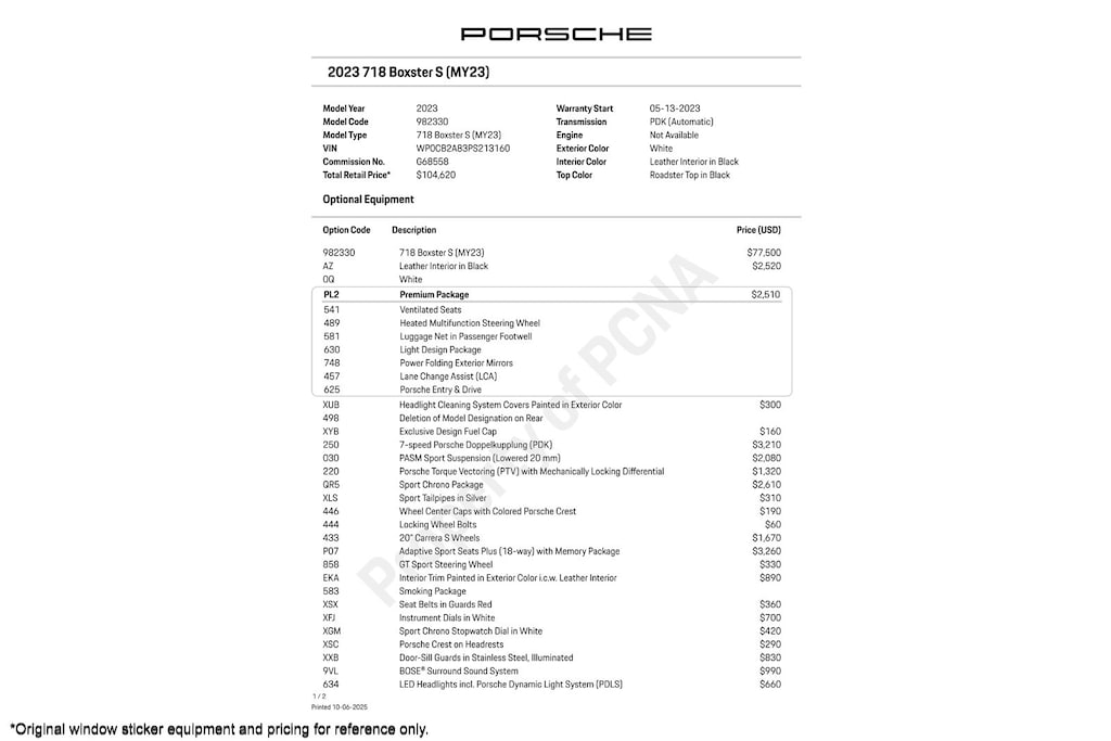 UPGRADED EQUIPMENT: Premium Package, Exclusive Design Fuel Cap, PASM Sport Suspension, Porsche Torque Vectoring, Sport Chrono Package, Sport Tailpipes in Silver, Wheel Center Caps w/ Colored Porsche Crest, Locking Wheel Bolts, 20" Carrera S Wheels, Adaptive Sport Seats Plus (18-Way) w/ Memory Package, GT Sport Steering Wheel, Interior Trim Painted in Exterior Color, Smoking Package, Seat Belts in Guards Red, Instrument Dials in White, Sport Chrono Stopwatch Dial in White, Porsche Crest on Headrests, Door-Sill Guards in Stainless Steel, Illuminated, BOSE® Surround Sound System, LED Headlights incl. Porsche Dynamic Light System