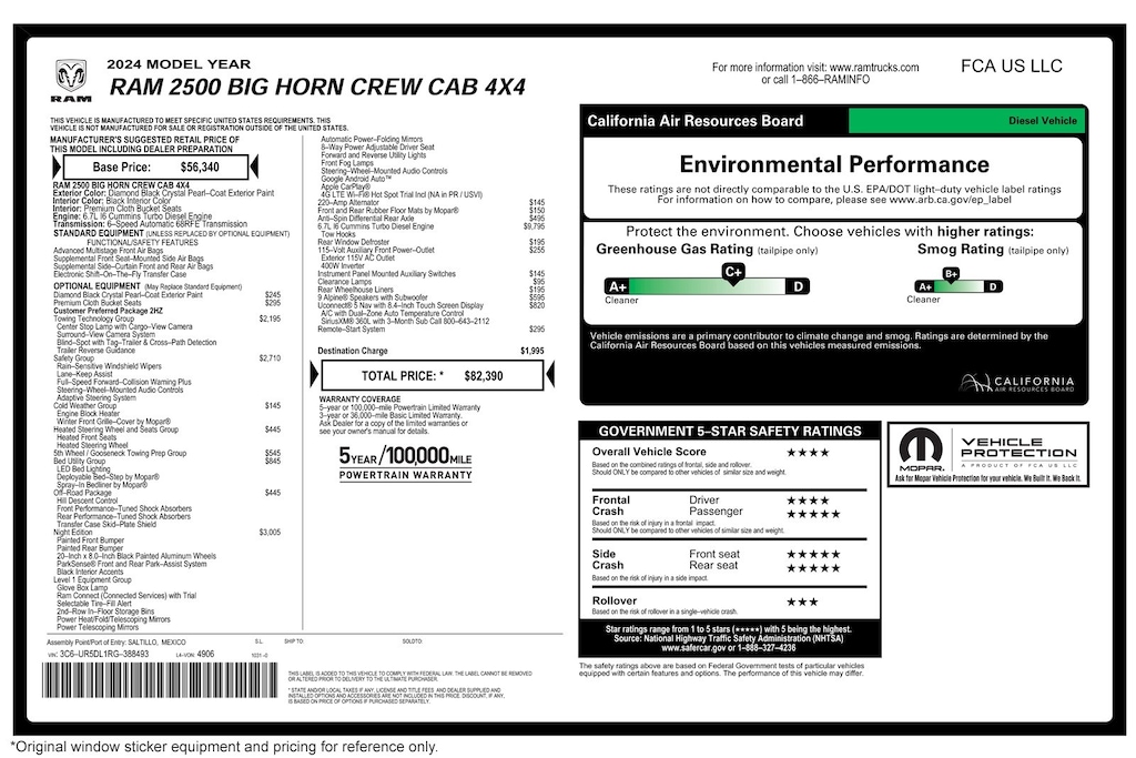 UPGRADED EQUIPMENT: Premium Cloth Bucket Seats, Towing Technology Group, Safety Group, Cold Weather Group, Heated Steering Wheel & Seats Group, 5th Wheel/Gooseneck Towing Prep Group, Bed Utility Group, Off-Road Package, Night Edition, 220–Amp Alternator, Front and Rear Rubber Floor Mats by Mopar®, Anti–Spin Differential Rear Axle, 6.7L I6 Cummins Turbo Diesel Engine, Rear Window Defroster, 115–Volt Auxiliary Front Power–Outlet, Instrument Panel Mounted Auxiliary Switches, Clearance Lamps, Rear Wheelhouse Liners, 9 Alpine® Speakers with Subwoofer, Uconnect® 5 Nav with 8.4–Inch Touch Screen Display, Remote - Start System