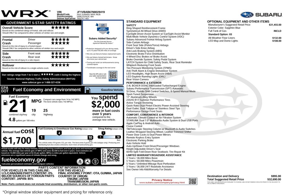 Audi Fletcher Jones presents this 2022 Subaru WRX CVT. This Subaru has 39,872 miles and comes in a Sapphire Blue on Carbon Black color combination. Live out of the area? Contact us to discuss convenient delivery options. (949) 791-1500