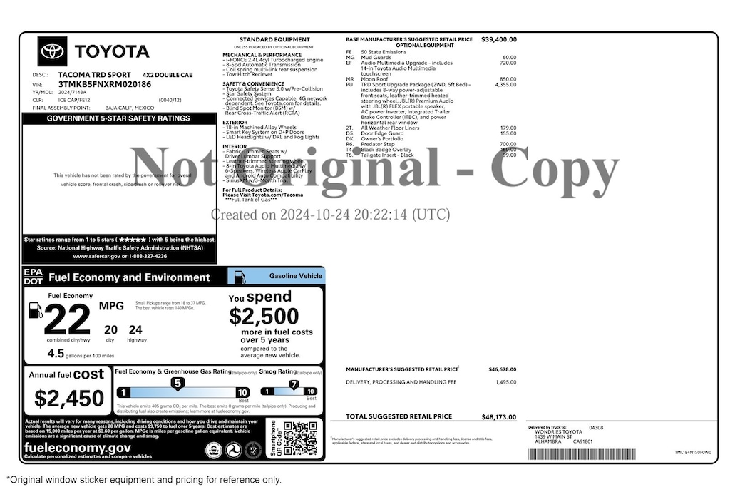 UPGRADED EQUIPMENT: 50 State Emissions, Mud Guards, Audio Multimedia Upgrade, Moon Roof, TRD Sport Upgrade Package, Door Edge Guard, Predator Step, Black Badge Overlay, Tailgate Insert - Black